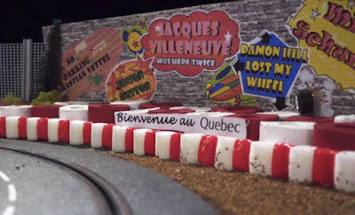 No fim de semana do GP do Canadá, descobri esta bela imagens no Facebook do João Carlos Costa, um dos narradores da Eurosport para a Formula 1. Não é real, é apenas uma imagem de uma pista de "slot cars", com este pormenor do "Muro dos Campeões" e de todos que já bateram por lá ao longo dos mais de vinte anos, quase desde o seu inicio.